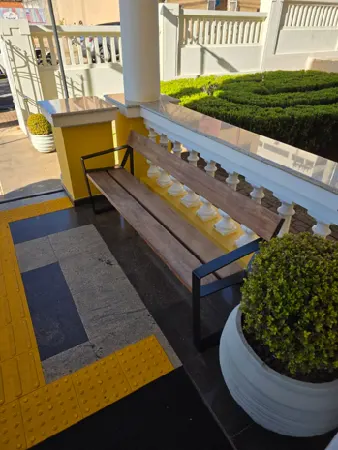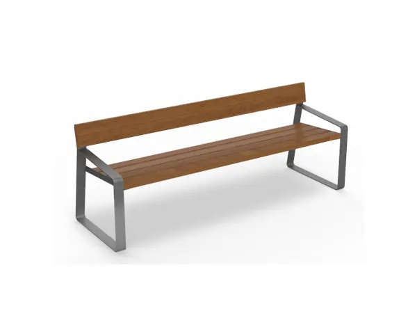 Banco com encosto e braço em estrutura de aço carbono galvanizado com revestimento em pintura eletrostática, assento e encosto em madeira de jatobá/madeira de tamarindo tratada com decking oil.