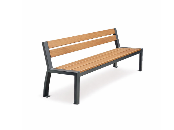 Banco confeccionado em aço galvanizado com acabamento em pintura a pó epoxi, assento e encosto em madeira tropical tratada com hidrofugante Stein. Pode ser mantido em áreas descobertas.