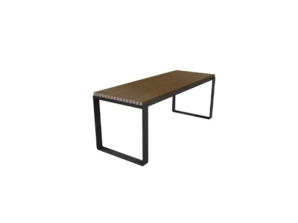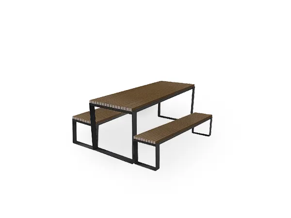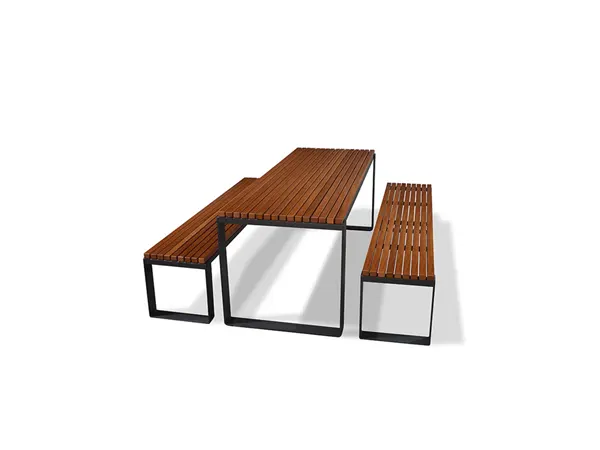 Mesa e bancos com tampo e assento em madeira de jatobá/madeira de tamarindo tratada com decking oil, e estrutura em aço carbono com revestimento de galvanização e pintura eletrostática.